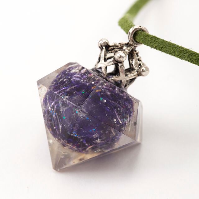まん丸の地球を閉じ込めたようなオルゴナイトペンダント エネルギーを集中させやすいパワフルなダイヤモンド型 神秘的な濃いパープルは 第7のチャクラを活性させる色 直観力やスピリチュアルな感性の発揮に オルゴナイト部 幅約3cm高さ約2.4cm 重さ約13g シルバーカラーの王冠風バチカン付き バチカン込み全長 約3.7cm 革ひも濃緑色 約67cm 金属たっぷりパワー重視派です( ̄▽ ̄) 送料無料 定形外郵便 オルゴナイトはハンドメイドです 一つ一つ丁寧にお作りしていますが、キズ、歪み、色ムラ等も多少あります 画像をよくご確認のうえ、 ハンドメイドにご理解ご納得いただける方のみご検討ください