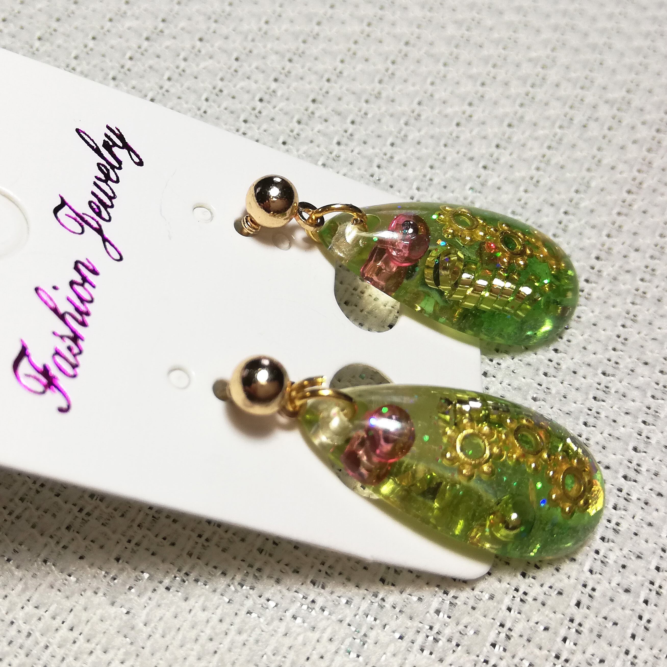 透明感のある爽やかな黄緑色のオルゴナイト ピアス上部から下部にかけて黄色から淡い緑へとグラデーションしています。 明るく無邪気なイエローと心を癒すグリーン、心を穏やかに、リラックスさせてくれそうですね。 オルゴナイト部分全長約2.3cm 幅約1.1cm 厚さ約0.5cm 重さ片耳約1.3g 金具部分はゴールドカラー 定形外郵便 幸運を引き寄せるオルゴナイトで作った一点物のピアスです。 オルゴナイトもピアスもハンドメイドの為、小さなキズ、歪み、色ムラ等も多少あります。 画像を良くご確認の上、ハンドメイドにご理解ご納得頂ける方のみご検討下さいます様お願い申し上げます。