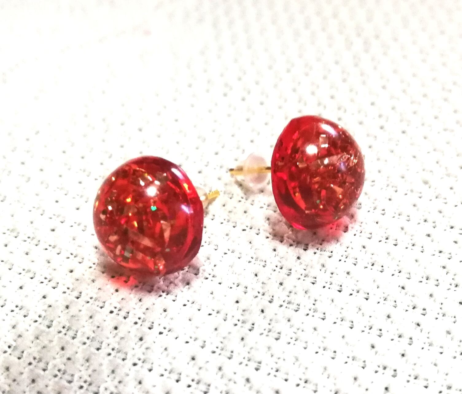 コロンとした可愛い半球型のオルゴナイトピアス 鮮やかな赤色にゴールドの金属入り 明るい色合いが反射して血色良く見せてくれます 赤は第1のチャクラを活性させるカラー。火の象徴である赤はやる気とパワーをもたらしてくれる色。 またゴールドとの相乗効果で冷え性の人が陥りやすい無気力や惨めな気持ちを払って、明るく前向きで強い人を作ります。 オルゴナイト部直径約11㎜ 厚さ約7㎜ 重さ約0.8g(片耳) ゴールドカラーのポスト&キャッチ付 定形外郵便 オルゴナイトもピアスもハンドメイドです 小さなキズ、歪み、色ムラ等も多少あります 画像をよくご確認のうえ、ハンドメイドにご理解ご納得いただける方のみご検討ください