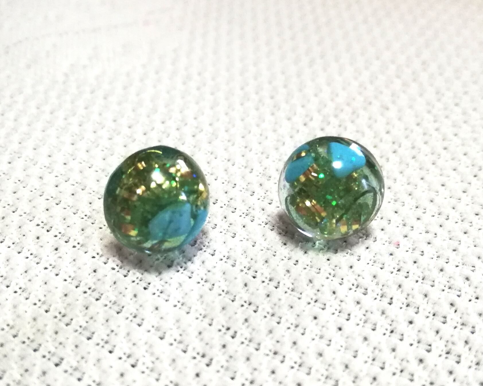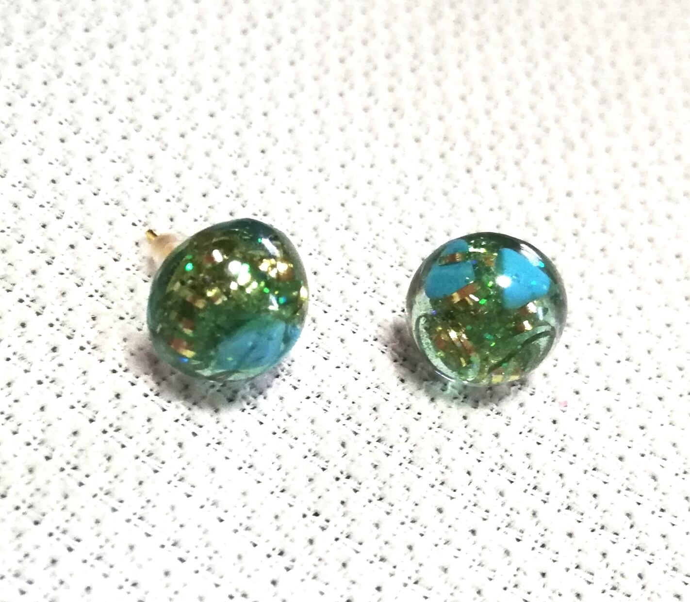 コロンとした可愛い半球型のオルゴナイトピアス 淡い緑色にターコイズとゴールドの金属入り 爽やかな色合いが反射してお顔を華やかに見せてくれそう 緑は愛を司る第4のチャクラを活性させるカラーであると共に心身を癒すヒーリングカラーです。 加えてターコイズの青も心を浄化してくれるので、ストレスや疲れを緩和したい時におススメです。 オルゴナイト部直径約11㎜ 厚さ約7㎜ 重さ約0.8g(片耳) ゴールドカラーのポスト&キャッチ付 定形外郵便 オルゴナイトもピアスもハンドメイドです 小さなキズ、歪み、色ムラ等も多少あります 画像をよくご確認のうえ、ハンドメイドにご理解ご納得いただける方のみご検討ください