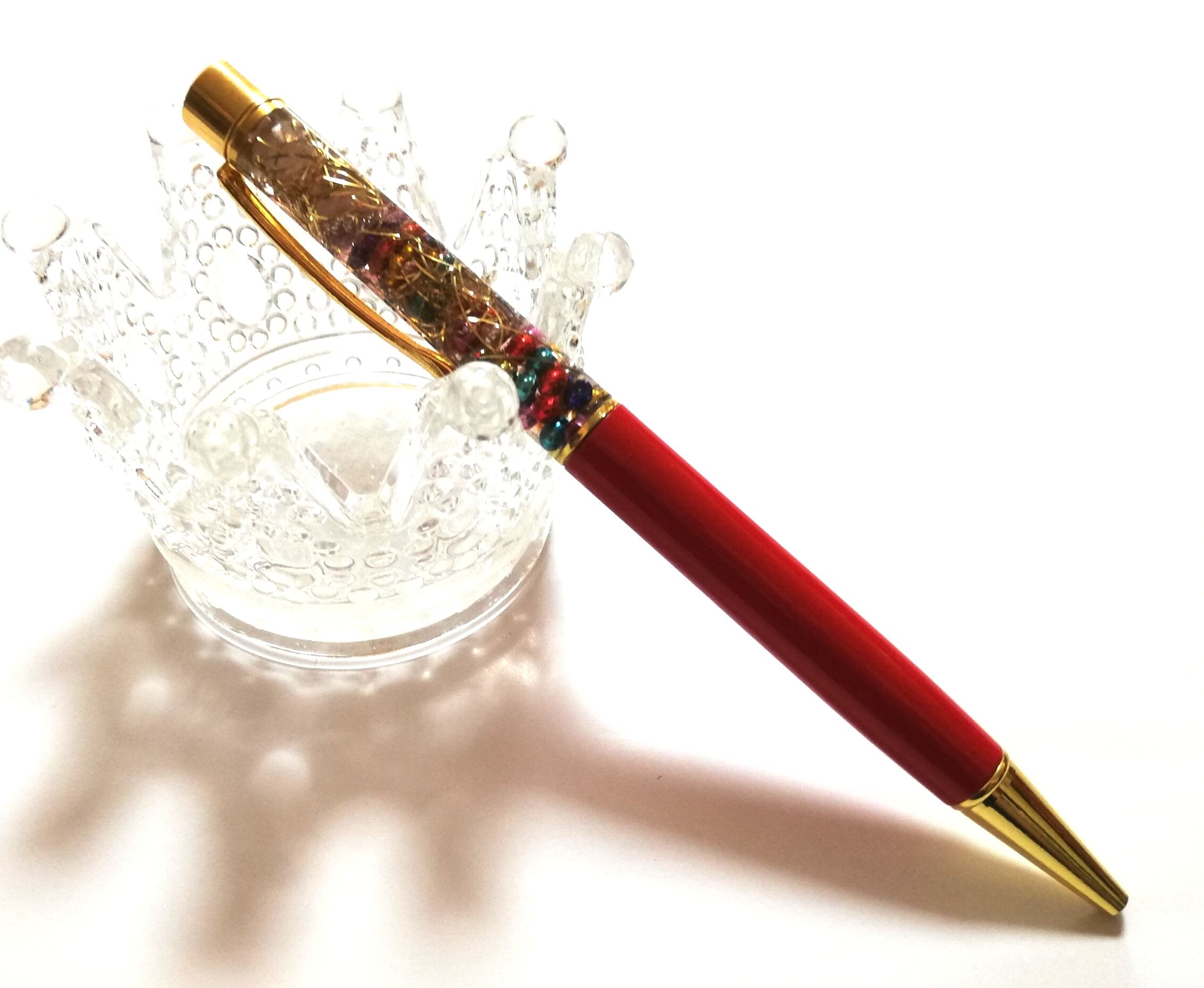第1のチャクラを活性化する赤色のボールペンです。 キャップ部分にたっぷり金属入ってます。 火の象徴である赤はやる気とパワーをもたらしてくれる、勝利を呼ぶ色なので、試験、恋愛等で力を発揮したい時にも活躍しそうです。 クリップ付きボールペンなので持ち歩きしやすく、使い勝手の良いアイテムです。 キャップ、ペン先、ゴールドカラー 黒インク 替え可能(替え芯は付いてません) 芯の太さ 0.8mm 定形外郵便 オルゴナイトはハンドメイドです 一つ一つ丁寧にお作りしていますが、キズ、歪み、色ムラ等も多少あります 画像をよくご確認のうえ、 ハンドメイドにご理解ご納得いただける方のみご検討ください
