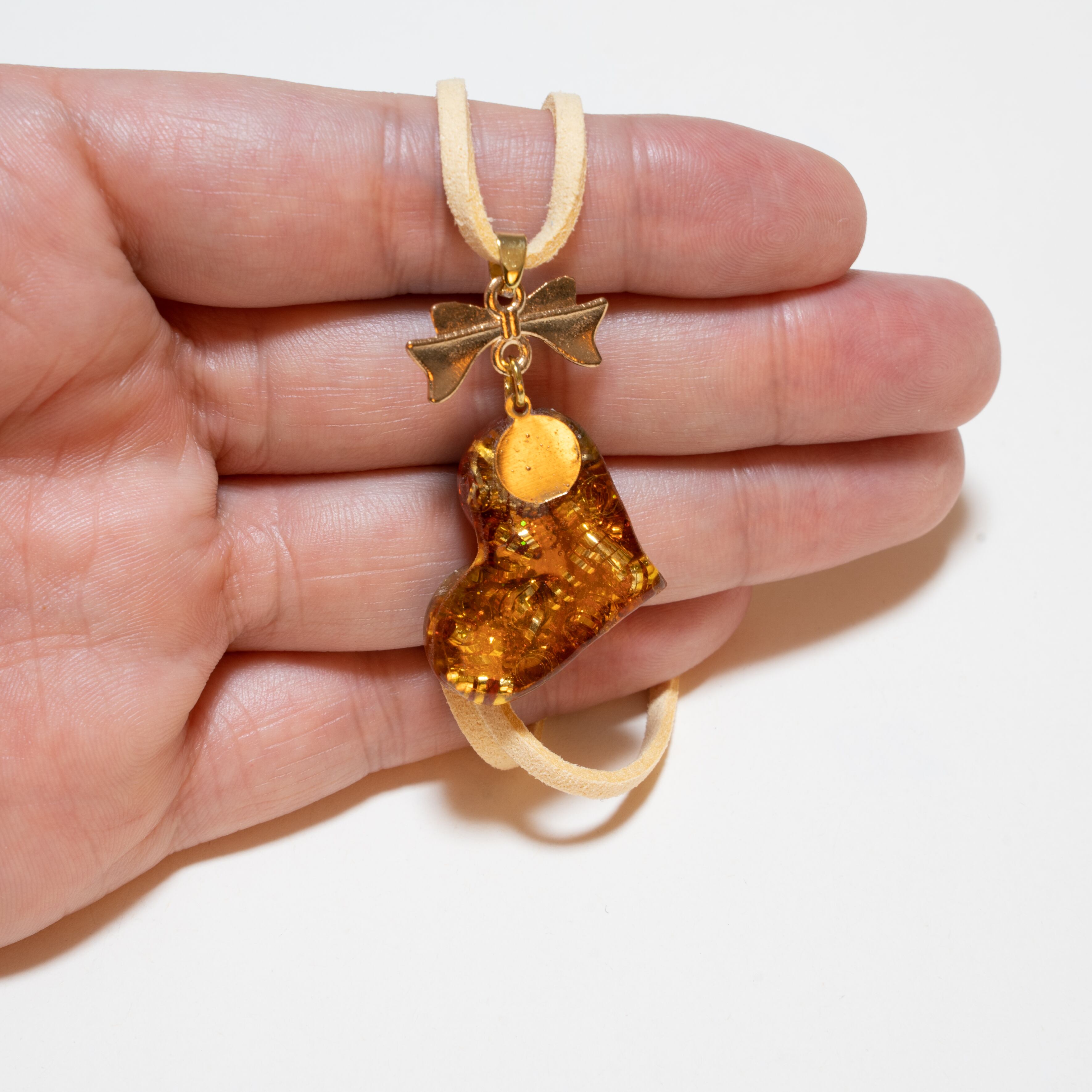 カワイイハート型オルゴナイトの中に金色の金属や綺麗なパワーストーン入り