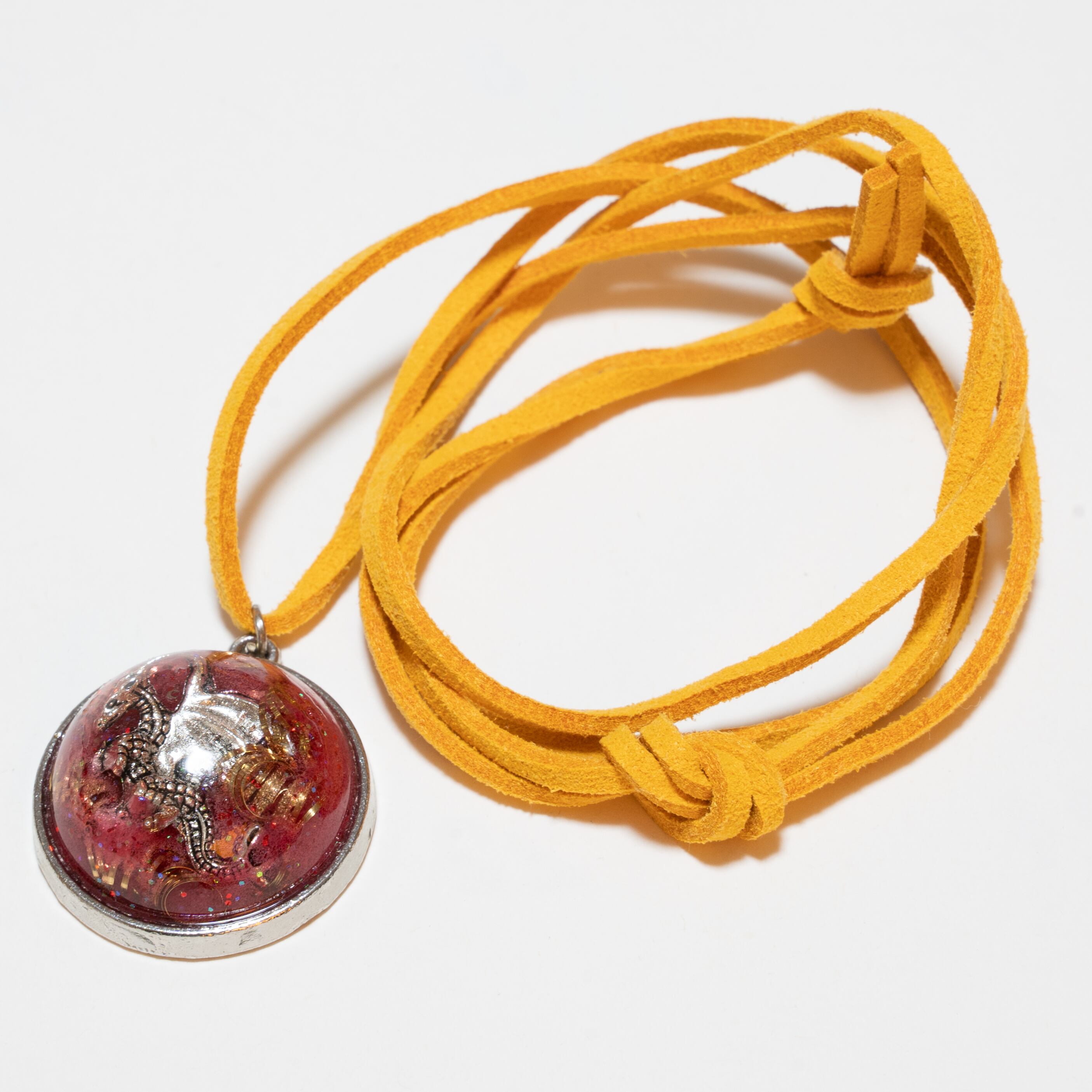 第1チャクラを活性する赤色はやる気とパワーそして勝利をもたらしてくれる色と言われ、 力を発揮したい時に時にオススメの色 ぷっくり半球ペンダントの中にはシルバー色のドラゴン入りで甘くなりすぎないペンダント オルゴナイト部 長さ 約2.5cm 幅 約2.5cm 厚さ 約1.2cm 重さ約9g 革ひも オレンジ色 約82cm お好きな長さで調整して自由にご使用ください。 定形外郵便 オルゴナイトはハンドメイドです 一つ一つ丁寧にお作りしていますが、キズ、歪み、色ムラ等も多少あります 画像をよくご確認のうえ、 ハンドメイドにご理解ご納得いただける方のみご検討ください