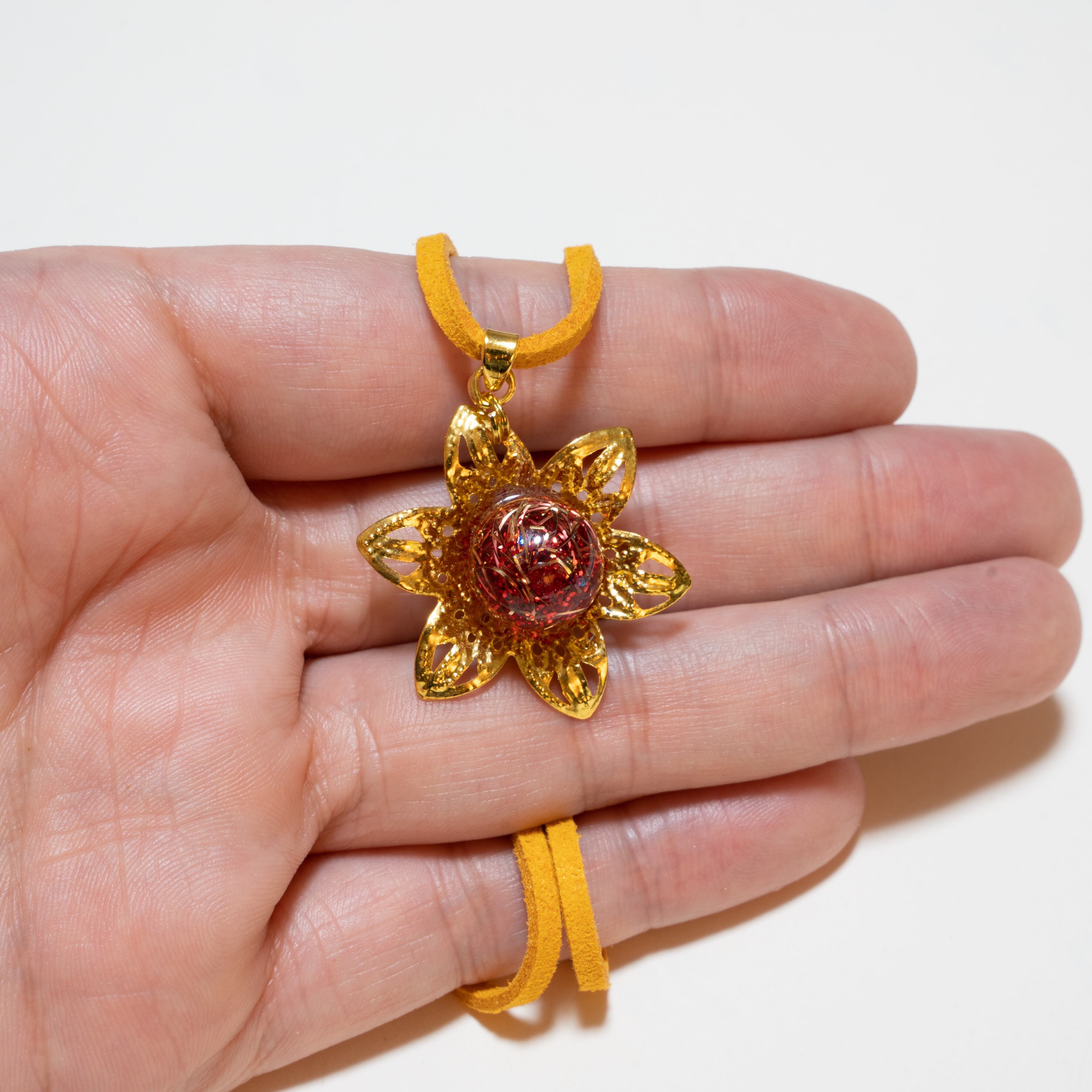 花弁はゴールドカラーのチャームで花序の部分にまん丸のオルゴナイトが接着されています。